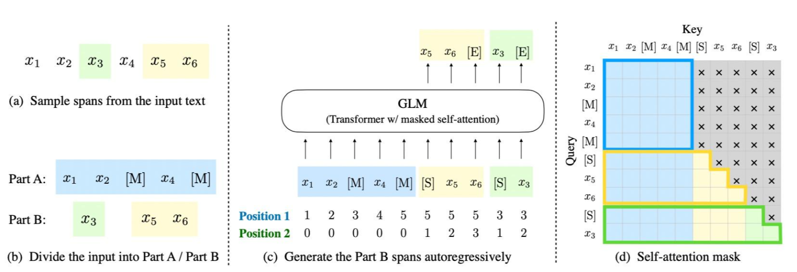 - 自注意力掩码。 灰色区域被掩盖。Part A 的词语可以自我看到(图蓝色框),但不能看到 Part B。 Part B 的词语可以看到 Part A 和 Part B 中的前面的词语(图黄色和绿色框对应两个片段)。 [M] := [MASK],[S] := [START],[E] := [END]