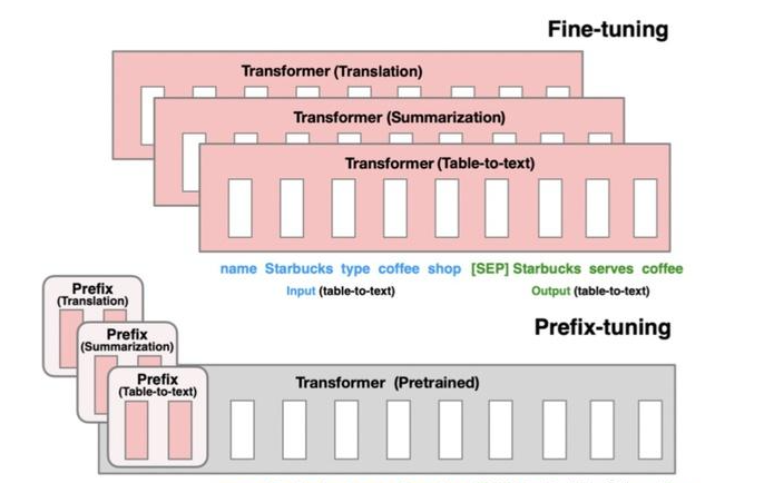 Prefix-Tuning 在模型输入前添加一个连续的且任务特定的向量序列(continuous task-specific vectors),称之为前缀(prefix)。前缀被视为一系列“虚拟 tokens”,但是它由不对应于真实 tokens 的自由参数组成。与更新所有 PLM 参数的全量微调不同,Prefix-Tuning 固定 PLM 的所有参数,只更新优化特定任务的 prefix。因此,在生产部署时,只需要存储一个大型 PLM 的副本和一个学习到的特定任务的 prefix,每个下游任务只产生非常小的额外的计算和存储开销。