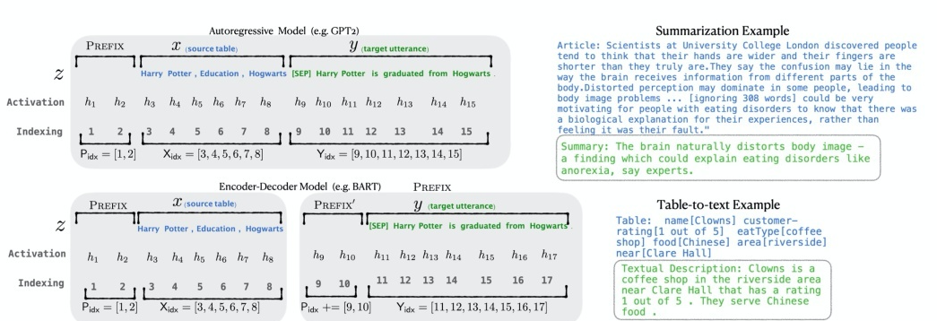 如下图所示,以 GPT2 的自回归语言模型为例,将输入 x 和输出 y 拼接为 z=[x;y] ,经过 LM 的某一层计算隐层表示h=[h_1,...,h_i,....,h_n] , h_i=LM_Ø(z_i, h<i) ,其中, X_{idx} 和Y_{idx}分别为输入和输出序列的索引。