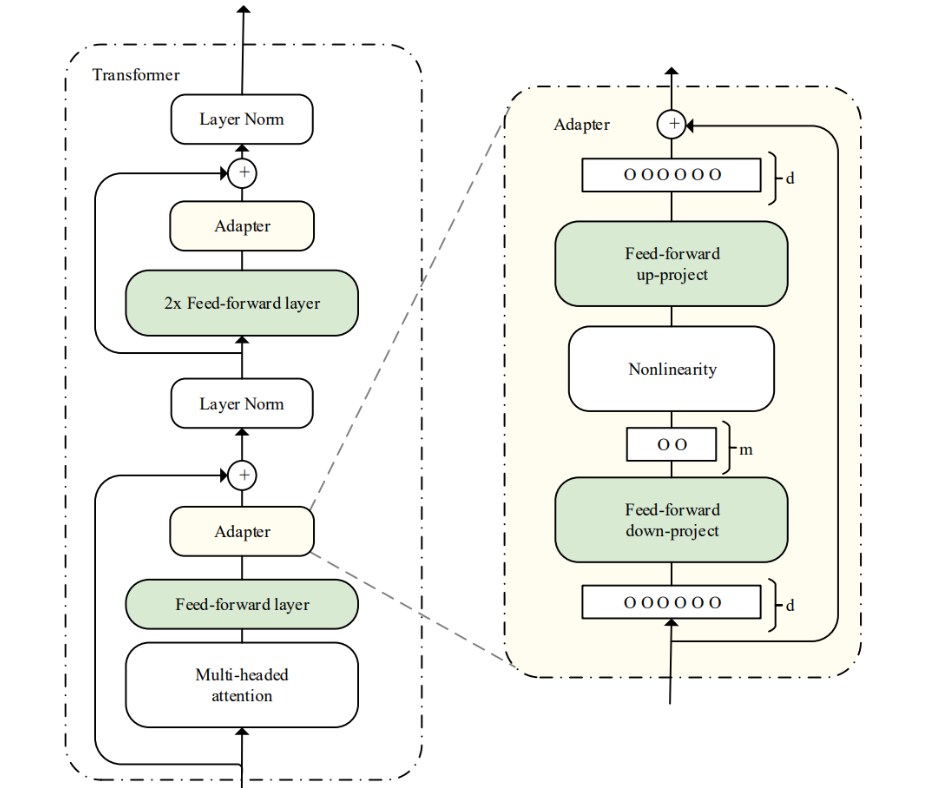 Series Adapter的适配器结构和与 Transformer 的集成如上图所示。适配器模块被添加到每个 Transformer 层两次:多头注意力映射之后和两层前馈神经网络之后。适配器是一个 bottleneck(瓶颈)结构的模块,由一个两层的前馈神经网络(由向下投影矩阵、非线性函数和向上投影矩阵构成)和一个输出输出之间的残差连接组成。