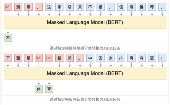 [MASK]预测的词是“不”,则认为是差评类,如果是“很”,则认为是好评类。图中示例2:新闻分类任务(多分类),原始文本:中国女排再夺冠!PET模版:下面是[MASK] [MASK]新闻,Label:体育/财经/时政/军事