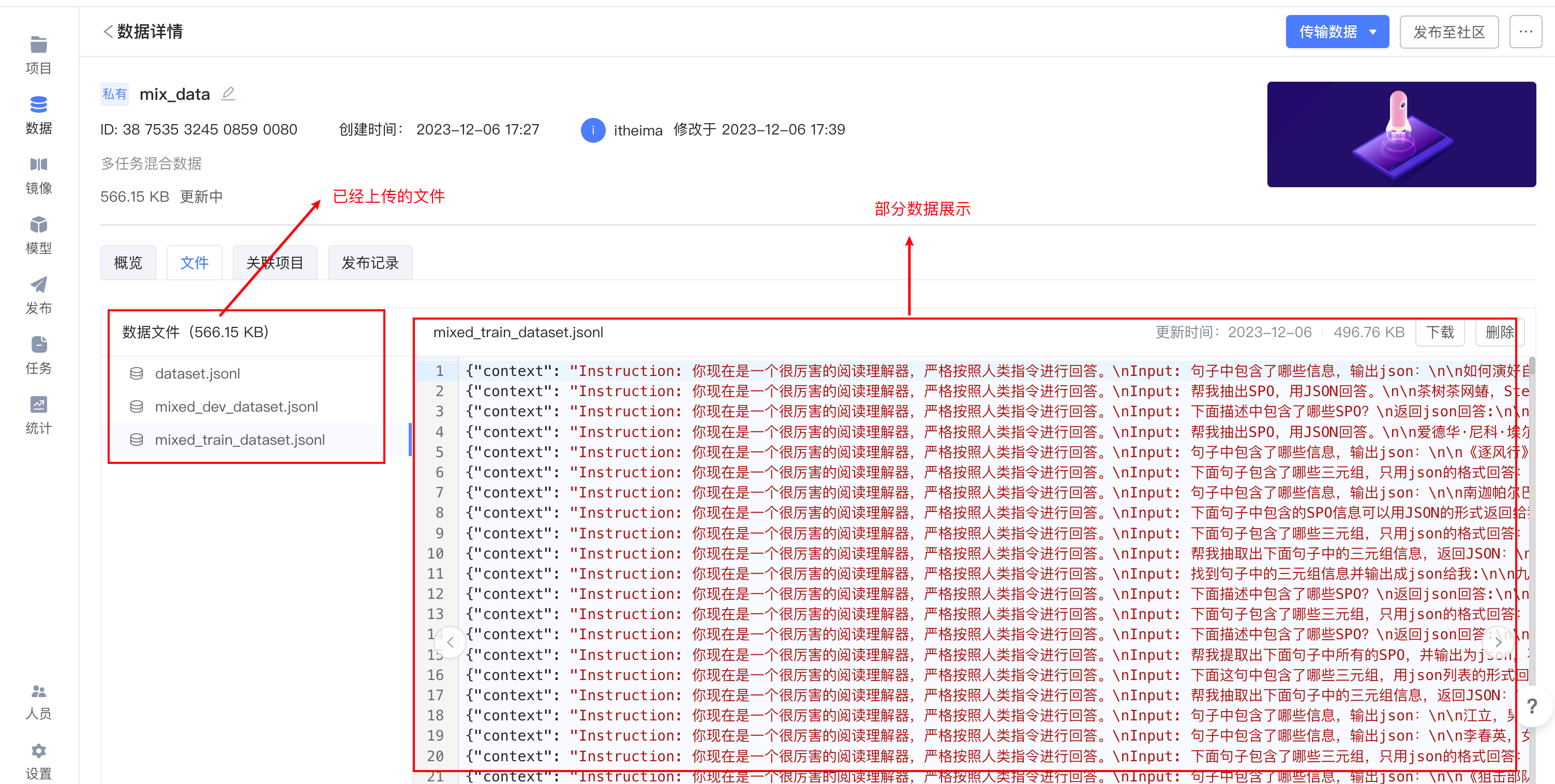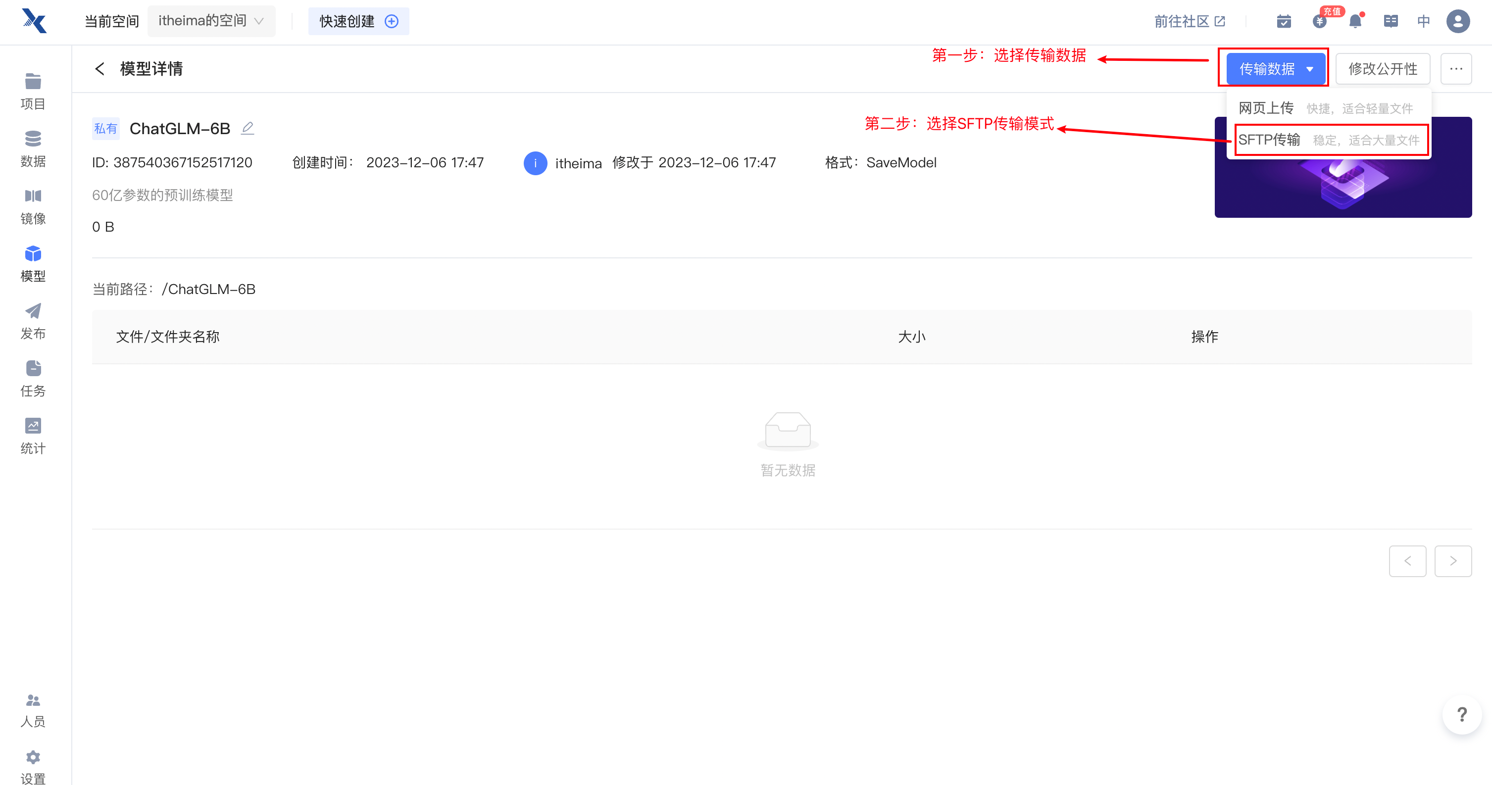 - 注意我们想要使用趋动云进行模型代码的微调实现,需要创建项目进行运行。但是因为我们使用的数据集和预训练模型都属于本地自己拥有的,所以需要在趋动云上首先「添加数据源」和「添加预训练模型」