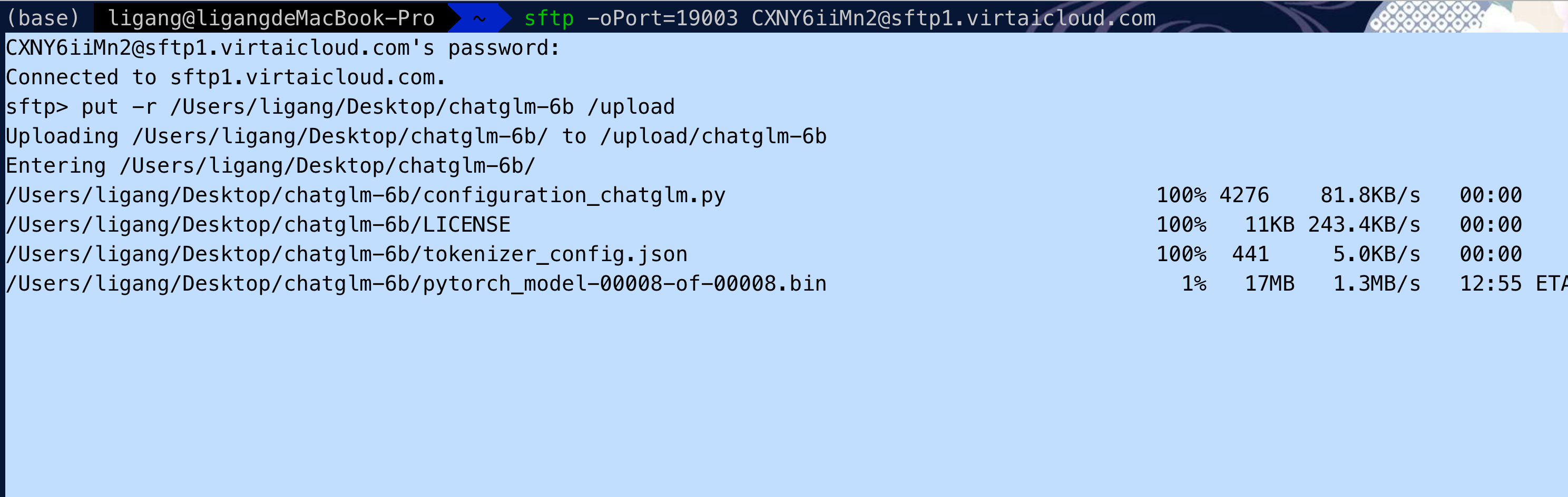scp -p 30022 -r itheima@root@ssh-736af97802ac911f1b7f454489821925.swwutgwduthw@ssh.virtaicloud.com:/gemini/code/checkpoints/ptune/model_best ~/Desktop