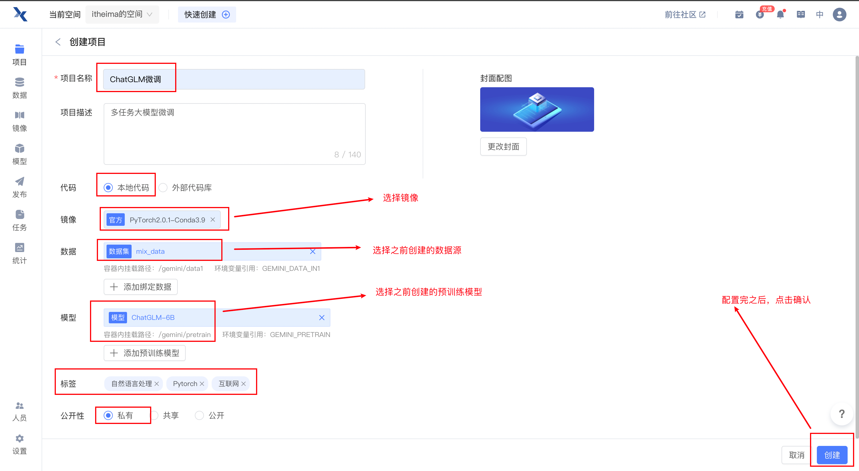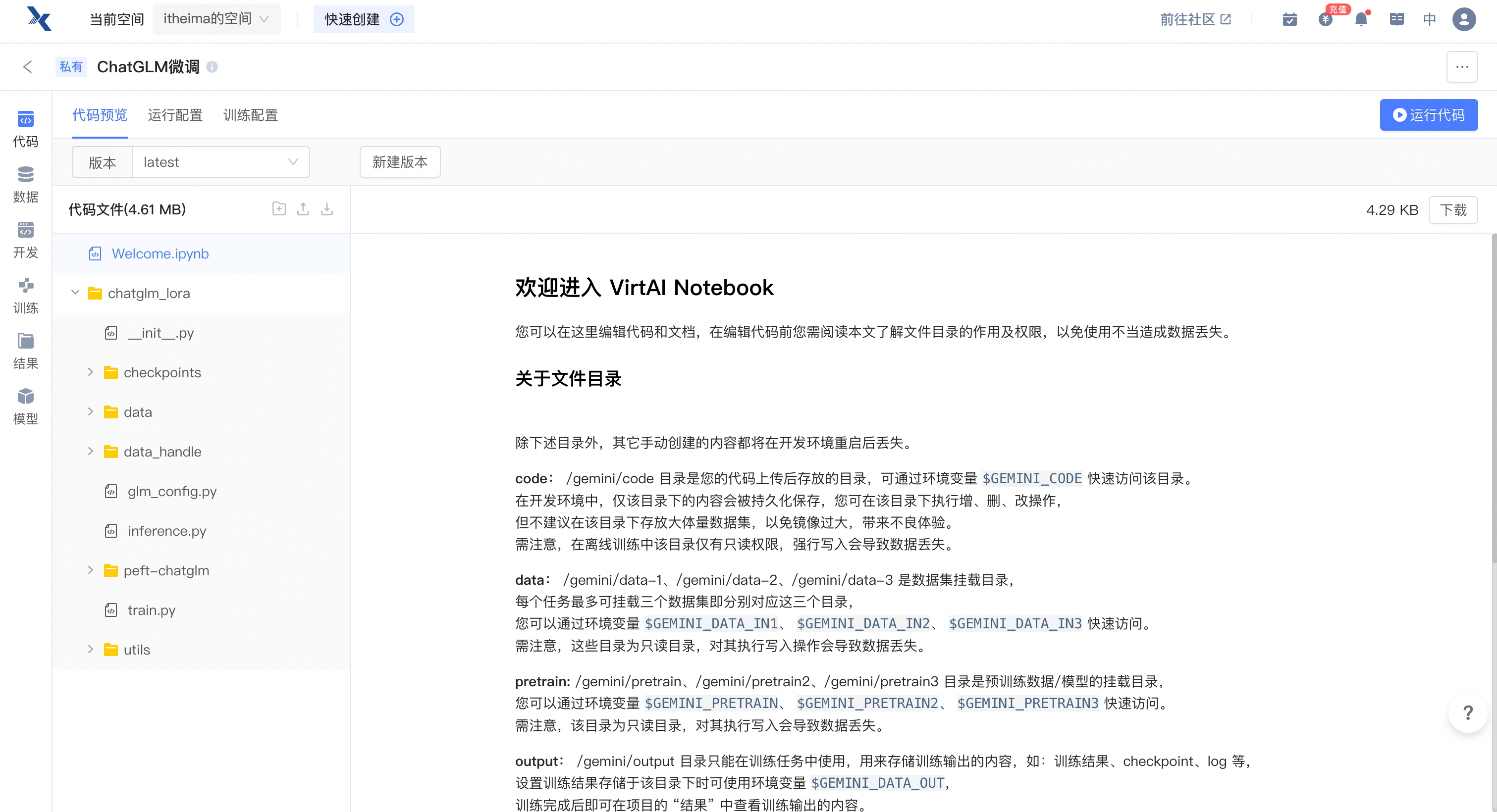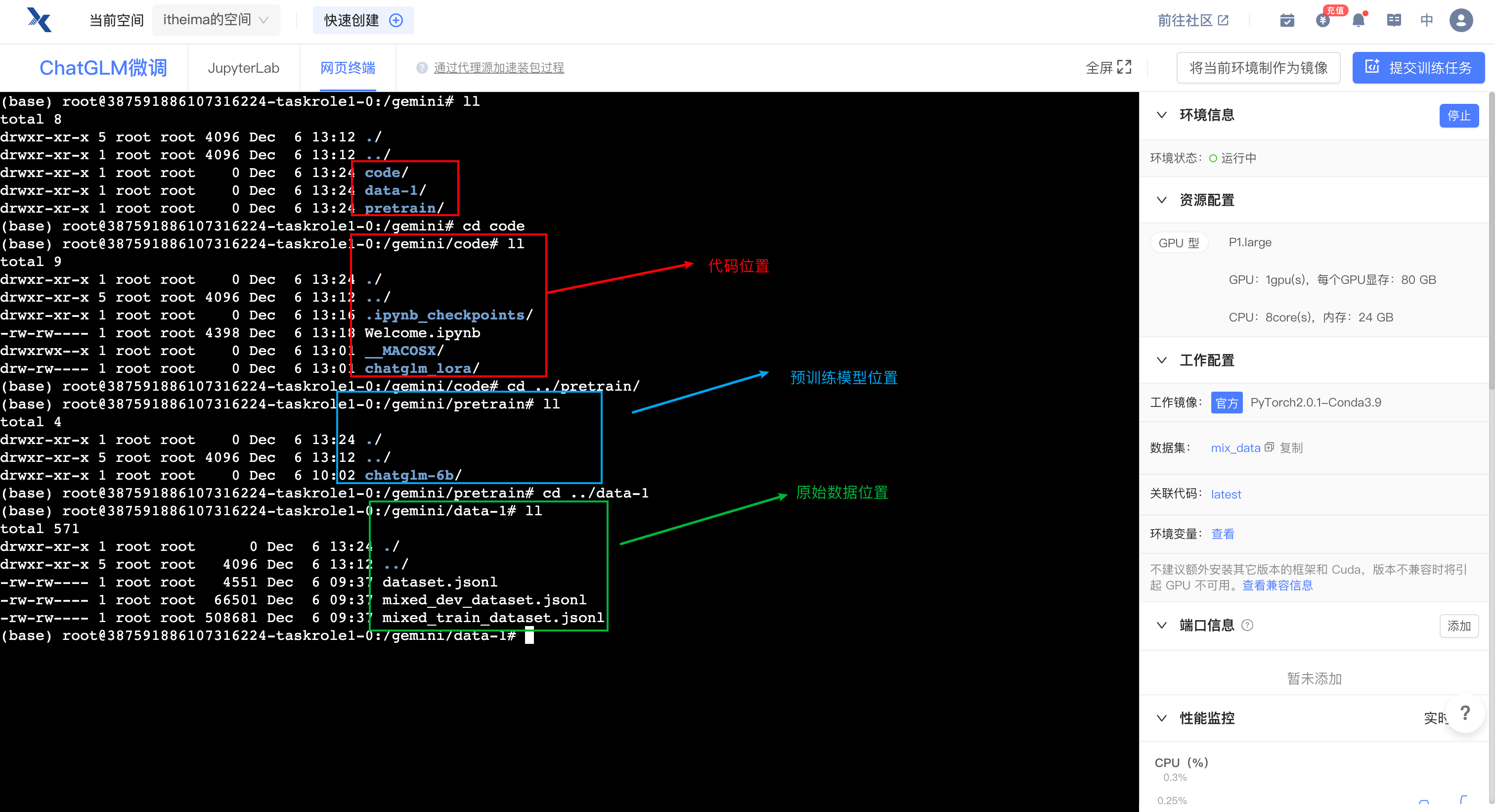 注意:创建项目后,数据会默认保存的路径为:/gemini/data1下,预训练模型会自动保存在/genmini/pretrain下