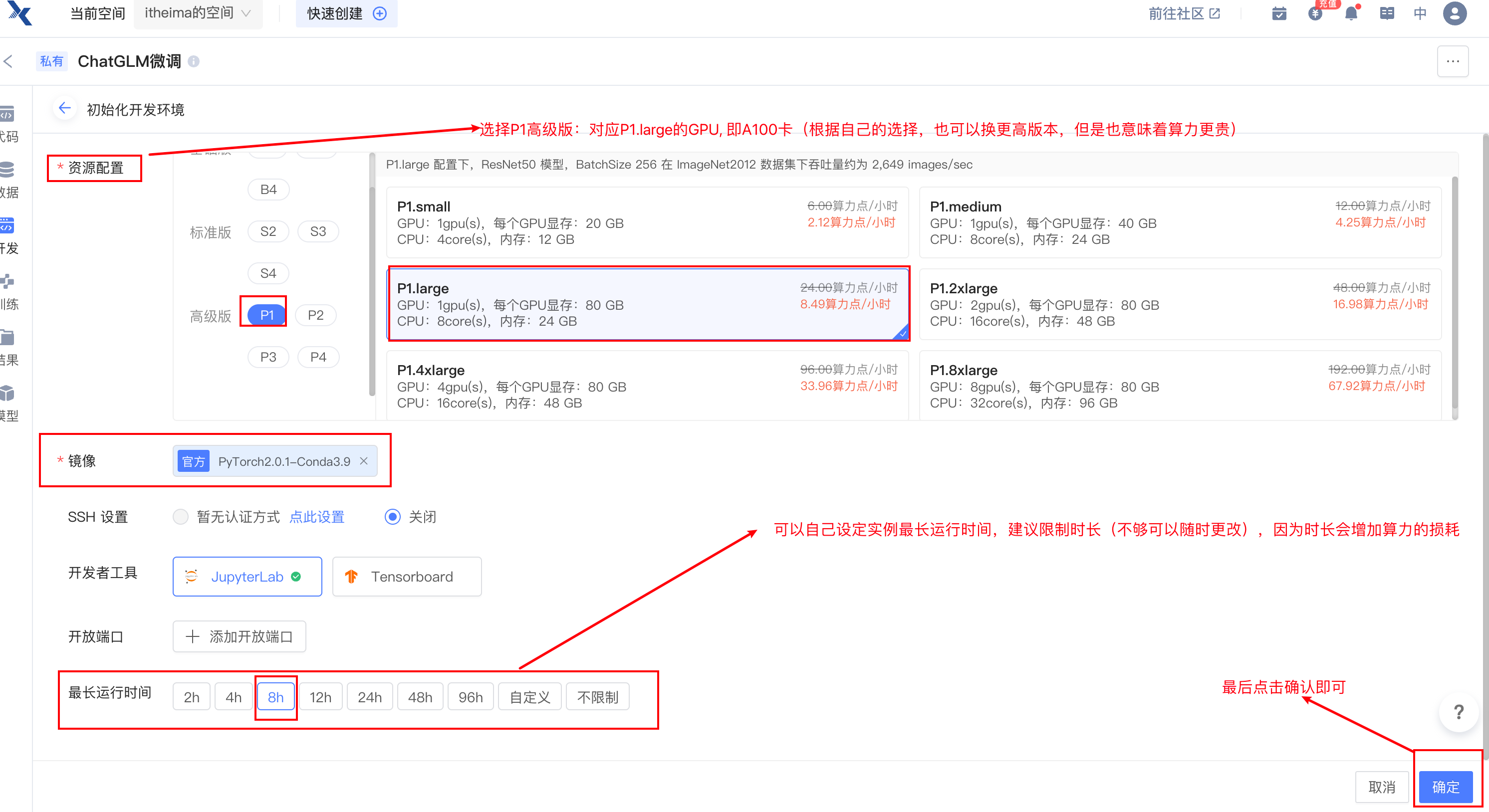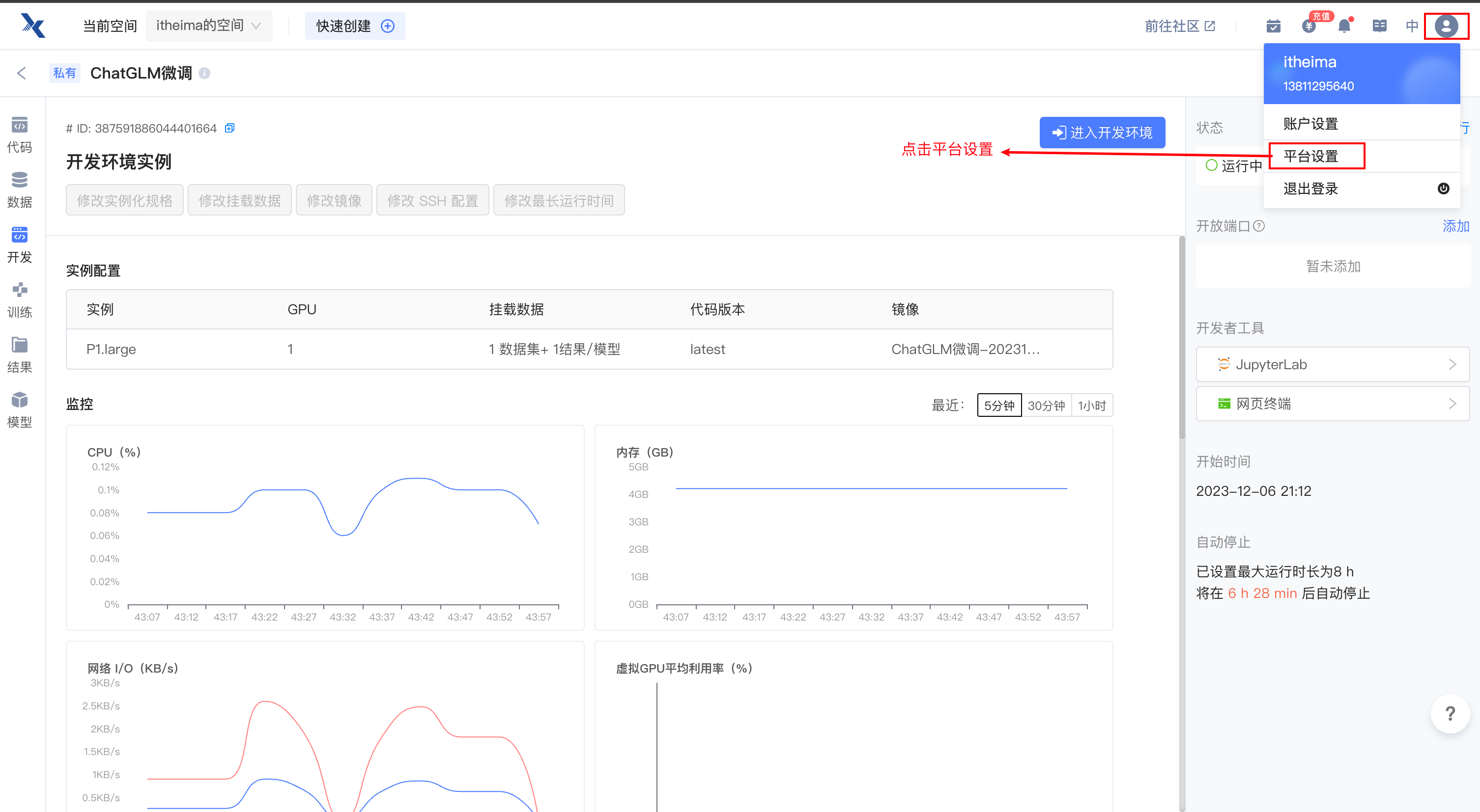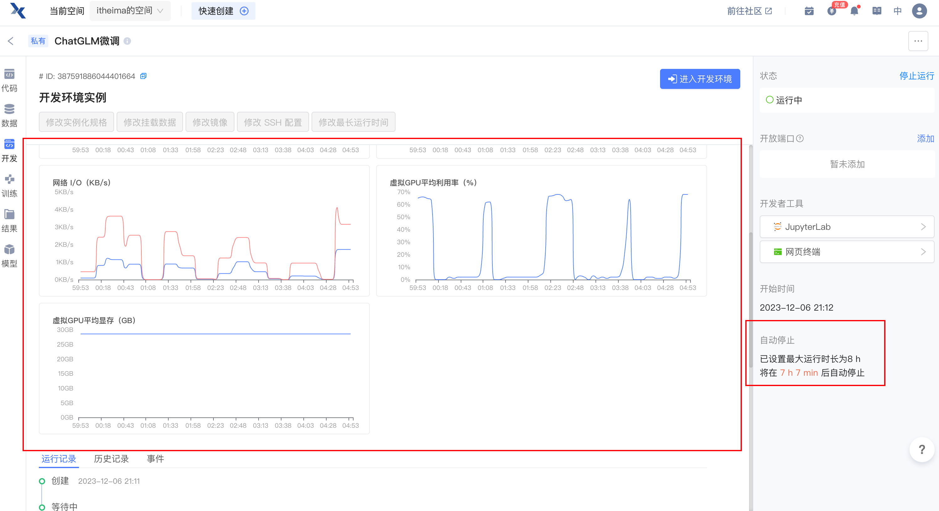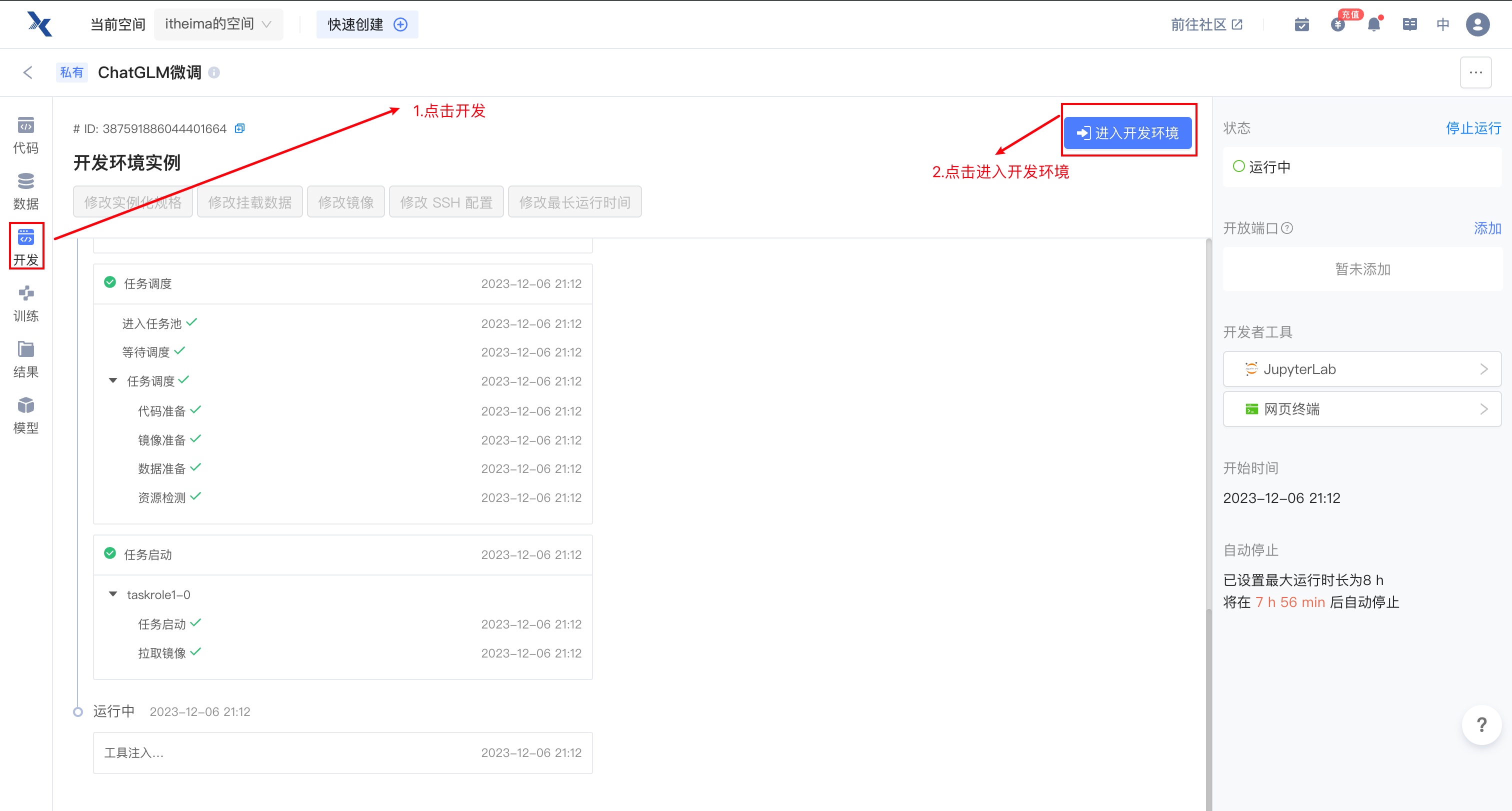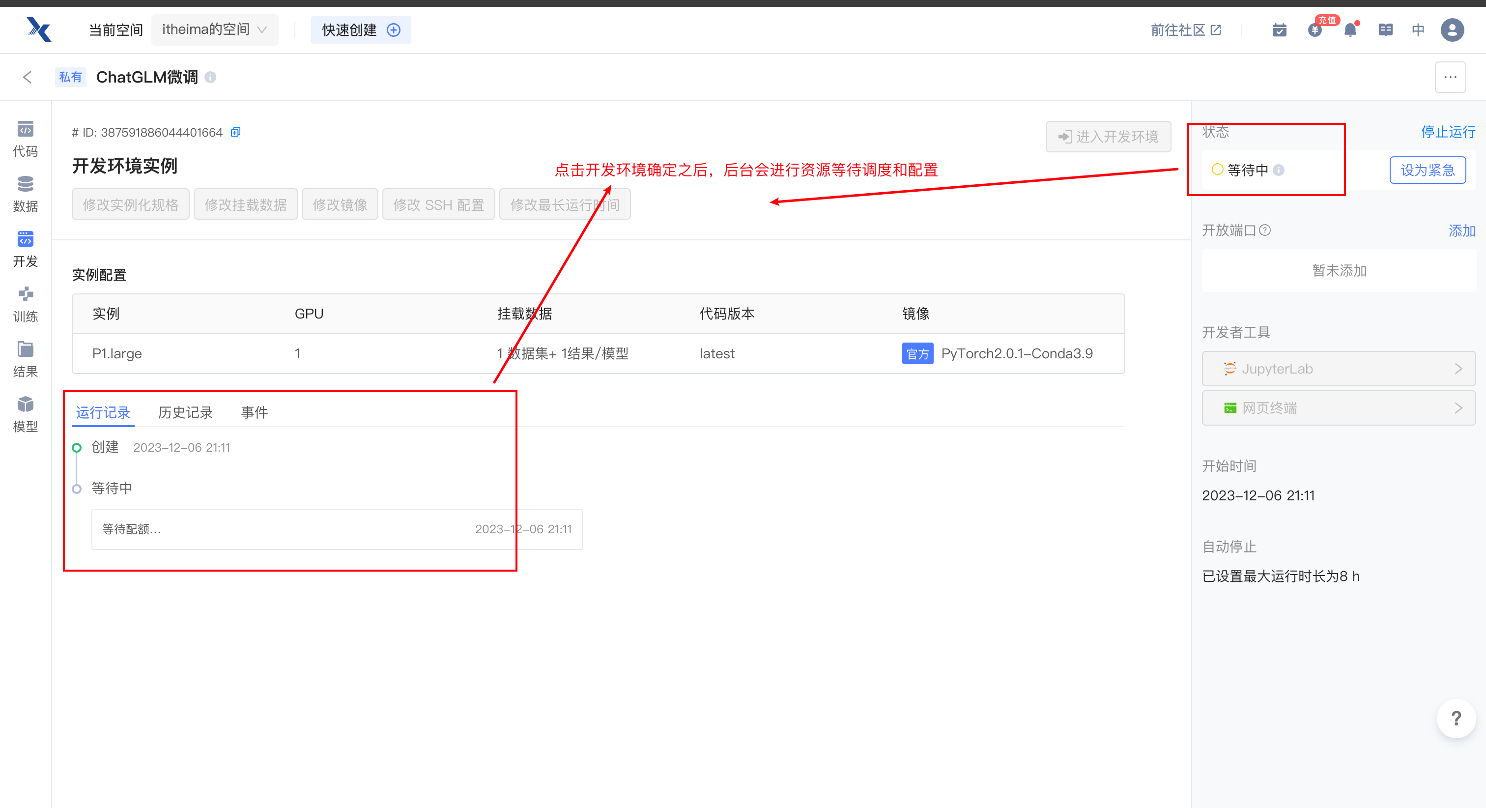 注意只要进入开发环境,就会产生费用,为了节省资源,可以将实例规格进行减配,节省算力